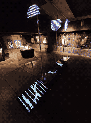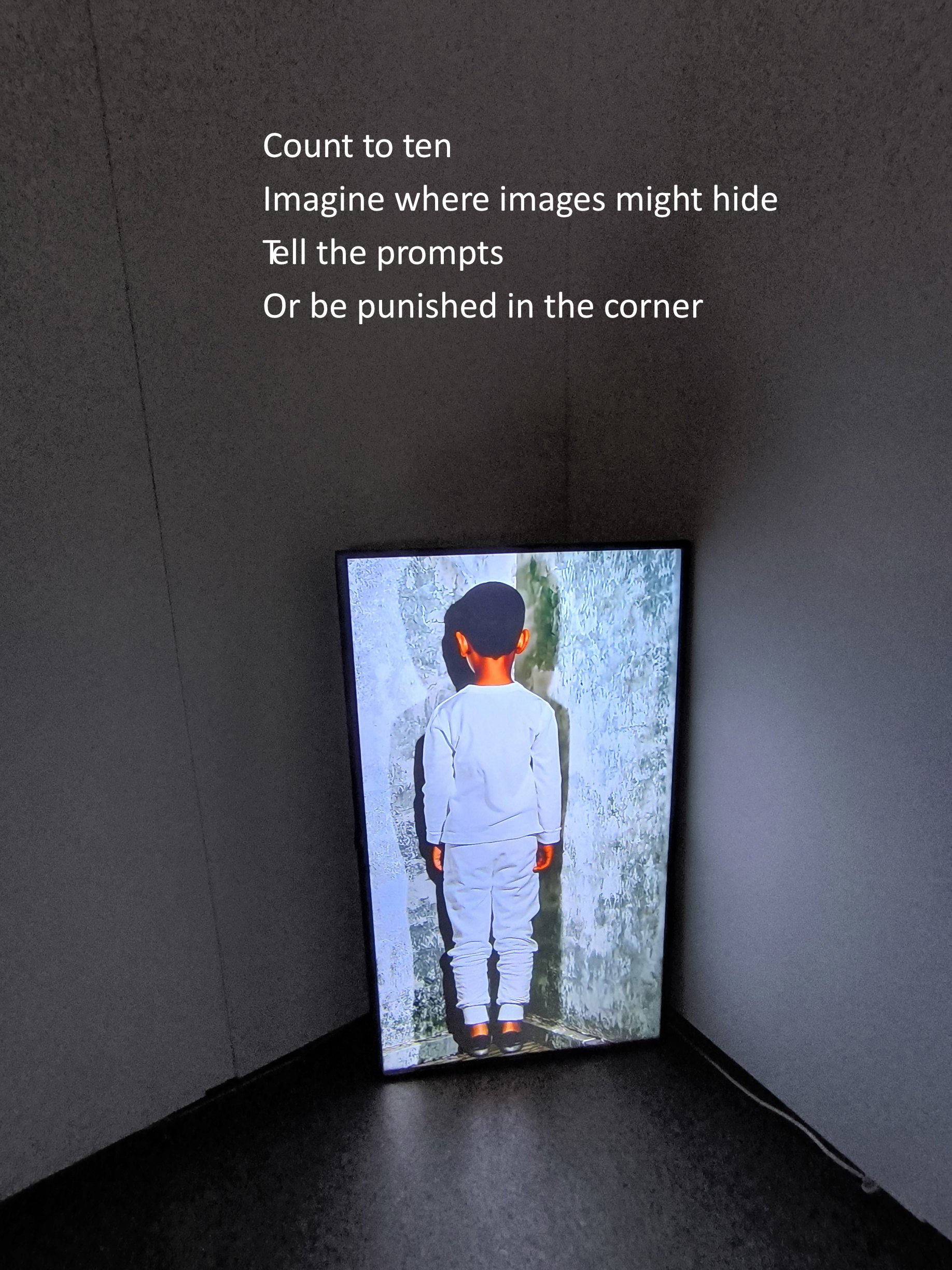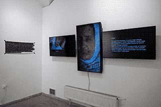 Auf mehreren Monitoren sind abstrakte Oberflächen in Bewegung zu sehen, die sich scheinbar im Widerstreit befinden. Dazu zeigen drei 3D-Hologramme Worte, die von einer künstlichen Intelligenz generiert wurden. Es handelt sich um Wortneuschöpfungen für menschliche Tätigen, die es noch nicht gibt und die vielleicht erst in Zukunft durch neue Erfindungen möglich sein werden.